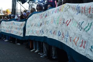 En el centro del tumulto un grupo de mujeres porta una bandera blanca, de bordes azules, lo suficientemente larga como para llevar 317 nombres de detenidos-desaparecidos de Entre Ríos. Las mujeres, o muchas de ellas, son las “Bordadoras de Memorias”, un grupo que desde octubre de 2025 se reúne, sorteando la diversidad de edades y recorridos de vida, para bordar, uno por uno, los nombres de quienes ya no están. Una producción de la memoria, una obra de arte también, que se suma a la convocatoria nacional de Madres de Plaza de Mayo y que se reprodujo en todo el país con miles de personas bordando de manera colectiva.
