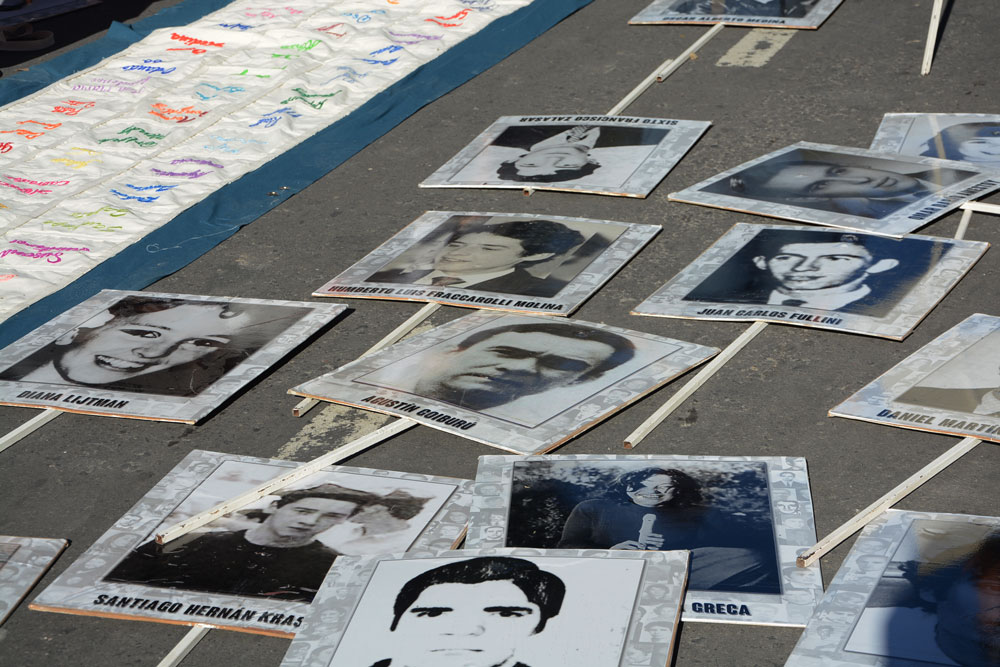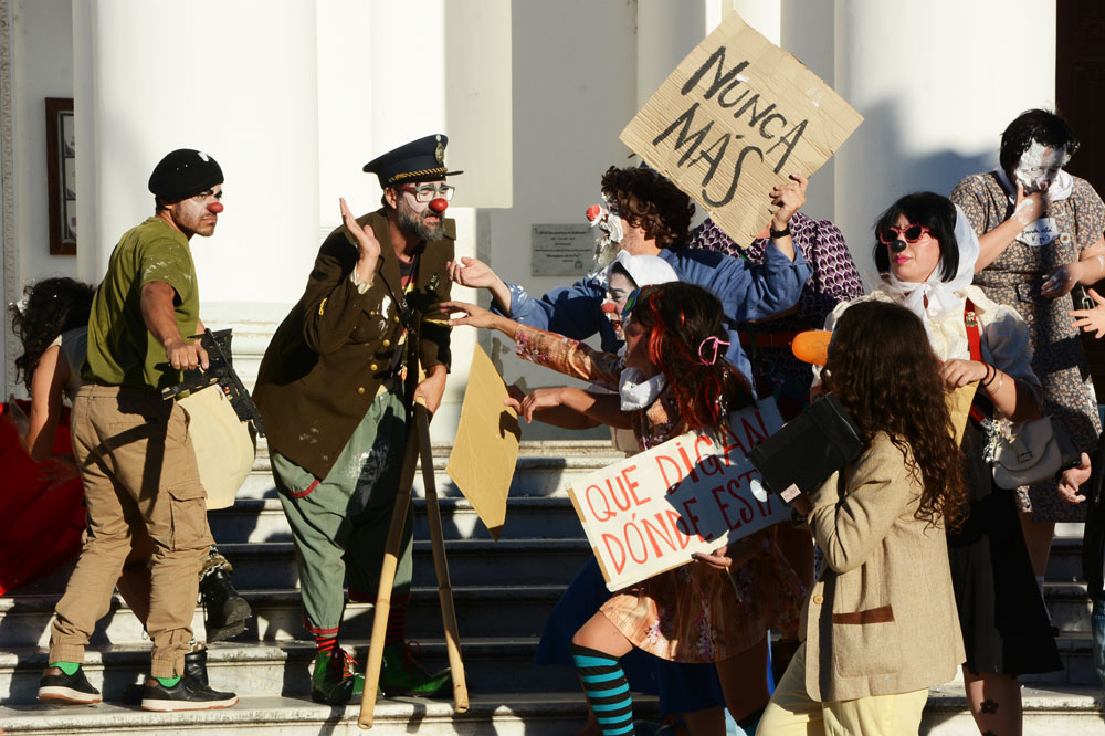 La movilización llega a la Catedral de Paraná. Enmarcada por la Municipalidad, la Escuela Normal y el gran edificio blanco de la iglesia católica se comienzan a escuchar los primeros gritos “¡qué digan dónde están!,¡que digan dónde están!”. En las escaleras de la iglesia mayor, actores y actrices, payasos y clowns, representan una obra de teatro callejera. Del lado izquierdo las cámaras del viejo canal ATC filman a gente que festeja, silba y tira papelitos; usando la expresión coloquial “están en un cumple”, desentendidos completamente de la realidad, mientras que del lado derecho otro grupo levanta carteles que dicen “Es imposible desaparecer”, “Nunca Más” y se enfrentan a los personajes que deambulan de izquierda a derecha, vestidos como militares con todo y bastones largos. Toman por la fuerza a algunos y los hacen pasar por un tubo de tela que representa la desaparición. Jorge Rafael Videla, la máxima expresión de la represión, había estado en Roma en 1977, junto al Papa VI, y al regresar al país pronunció la frase que se volvería emblemática del terrorismo de Estado: “es una incógnita, es un desaparecido, no tiene entidad, no está ni muerto ni vivo, está desaparecido.” El rol de la iglesia católica durante la última dictadura militar no es noticia, mientras algunos sectores de la iglesia acompañaron reclamos de familiares de desaparecidos, otros mantuvieron posiciones cercanas al poder militar o guardaron silencio frente a las violaciones a los derechos humanos, por eso el cántico “ustedes se callaron cuando se los llevaron” se renueva frente a la catedral.