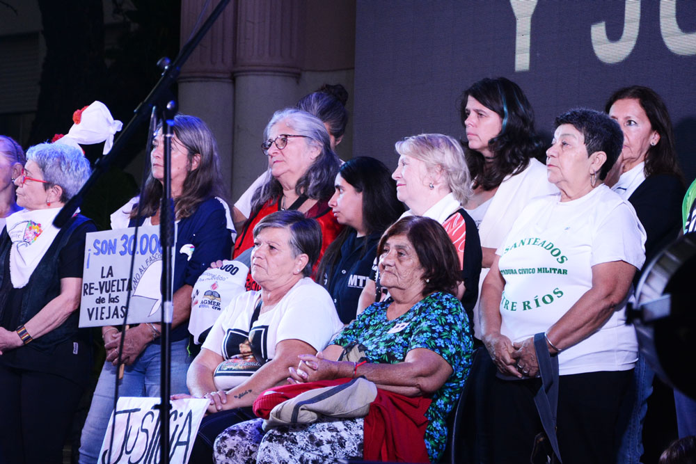 Luego de las acciones de rigor: cantar el Himno Nacional Argentino, nombrar a cada una y cada uno de los detenidos-desaparecidos y afirmar, a viva voz, que están presentes, ahora y siempre, comienza la lectura del documento consensuado por organizaciones, gremios y sindicatos que integran la Multisectorial de Derechos Humanos de Paraná. En uno de los laterales del escenario, se destaca la presencia de intérpretes de Lengua de Señas Argentinas, que acompañan el texto con profesionalismo y compromiso. En el centro de la escena están Isabel Vergara y Alejandra López, madres de Martín Basualdo y Gabriel Gusmán, víctimas de la Policía de Entre Ríos en democracia.