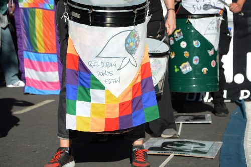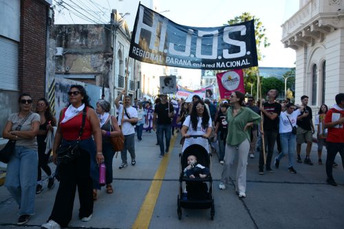 La marcha pasa por Tierra Bomba, hoy un espacio cultural que anteriormente funcionó como Dirección de Investigaciones de la Policía y estuvo vinculado a desapariciones previas al golpe. También recorre el Poder Judicial de Entre Ríos y la Casa de Gobierno, donde la multitud entona consignas contra las políticas del gobernador Rogelio Frigerio y de los legisladores que representan a la provincia a nivel nacional, a quienes se señala por haber acompañado medidas de endeudamiento, ajuste, privatización y extranjerización de territorios y bienes comunes. En este punto, desplegada sobre la vereda, aparece la bandera del colectivo LGBTIQ+, que señala el número “30.400” como una forma política y simbólica de indicar que hubo al menos 400 víctimas pertenecientes a disidencias sexuales y de género, perseguidas de manera particular, y que la represión en dictadura también tuvo un componente de persecución sistemática por identidad y orientación sexual, además de la posterior invisibilización de esas historias.