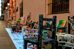 La intervención urbana se denominó a(dis)siento / en espera y, si bien el epicentro fue Concepción del Uruguay, otros artistas de la provincia sumaron su aporte con la intervención de sillas. «En Concepción decidimos que circulara en principio en lo que debería ser su sede actual, el ex Central Caseros, un edificio histórico donde hace tiempo se proyectó su espacio propio en lo que será un centro cultural, pero que, por diferentes razones la obra no se ha concluido», le contó Leti Ríos, integrante del Colectivo, a 170 Escalones. Luego, la intervención se trasladó a las veredas del Colegio del Uruguay como punto central de circulación entre los espacios que conformaron La noche de los museos.