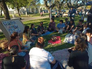 Luego, en el mismo espacio donde había estado Elena, se llevó a cabo otro taller sobre yuyos con una representante del Pueblo Nación Charrúa. En una ronda la gente se dispuso a conectar con la naturaleza. Mientras tanto, en otro sector bajo la sombra de los árboles, un grupo cantaba y realizaba actividades de percusión con el cuerpo. Así entonaron juntos las estrofas de “El Jangadero” y, luego de practicar varias veces, añadieron instrumentos que acompañaron el coro de voces.