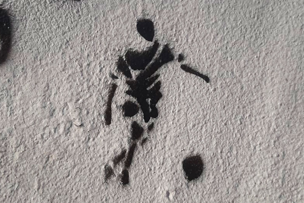 La figura de un esqueleto en pequeña escala que juega a la pelota está estampada en un paño nutrido de mensajes con plantilla y a mano alzada, en el muro perimetral del campo de deportes de la Colegio N° 1 «Domingo F. Sarmiento» (también conocido como Colegio Nacional), sobre calle Garay, entre Buenos Aires y San Martín.