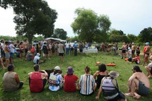 Sin exigencias físicas complejas -excepto para los nadadores- se conformaron «camalotes» entre kayaks o tablas, en los que se compartieron los mates y las charlas. Algunos palistas se zambulleron para una refrescada, otros recordaron la travesía del año anterior y debatían sobre el devenir del movimiento ambiental. Así transcurrieron los nudos náuticos hasta el desembarco en la isla El Letrero, donde la comunidad mocoví so Isoleq recibió a todos con bandejas de torta fritas. «Nos une el amor por este río, que es el origen de ellos, también», dijo Cosita, micrófono en mano, en una ronda sobre la barranca frente a la Toma Vieja. «Acá estamos nosotros tratando de compenetrarnos con esta familia y las diez y ocho comunidades que integran este lugar, con un agradecimiento al cacique Julio Romero», completó. Romero, que no es Cosita sino el cacique, expresó que «son todos bienvenidos acá, donde brindamos lo que tenemos a mano. Las puertas siempre están abiertas para la gente que pase. Fuerza en esta lucha en la que estamos, que no se detenga y que lleguemos al propósito que deseamos».