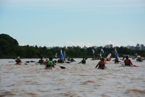 De a poco se fueron perdiendo de vista los humedales del oeste y las relucientes casitas de los edificios del Procrear de la zona de avenida Ejército. Al pasar cerca de la isla La Paciencia, se sumaron a la expedición seis kayakistas, todas mujeres, del Club Náutico Azopardo de Santa Fe, que habían acampado la noche anterior esperando el paso de la travesía.