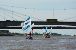 Desde la red de organizaciones y colectivos que conforman Remar contra corriente por el Agua, la Vida y la Soberanía, junto al Foro por la Recuperación del Paraná, denominaron a esta travesía Salvemos al Paraná y sus humedales. Con ese nombre avanza la remada de ochocientos kilómetros, que partió el 7 de marzo desde el río Paraguay, muy cerca de la confluencia con el Paraná, y que tiene previsto concluir el sábado 21 en Rosario. En cada tramo se van sumando pobladores, pescadores, militantes ambientales y gente vinculada al arte o al deporte que acompañan las embarcaciones en canoas, piraguas, kayak, tablas, veleros, lanchas e incluso a nado, como ocurrió el sábado 14 desde Villa Urquiza hasta la capital entrerriana. En cada descanso se realiza un acto cultural, político y espiritual de concientización. La oposición al dragado a 44 pies (unos 14 metros de profundidad) que impulsa el gobierno nacional para poder ingresar barcos de ultramar a un sector del río, es otra de los lemas unificados.