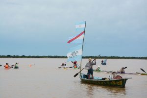 Hubo menos gente que el año anterior: el festival cultural armado en Paraná no resultó tan atractivo para el público como en 2025. De todos modos, el marco fue de celebración en la lucha. Una gran bandera argentina desplegada sobre la playa completaba la escena. A diferencia de la travesía pasada en la que inmediatamente las personas rodearon a las embarcaciones ni bien se frenaron en la costa, en este caso el río en bajante dejo un tramo de barro entre el agua y la arena que le dio una pausa a ese encuentro, prolongando el canto de la consigna común antes de enterrar los pies en la mezcla fresca y pegajosa.