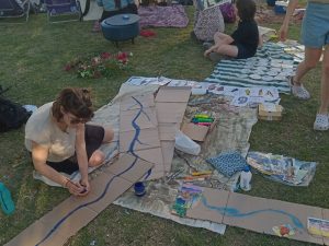 Una hilera de puestos de artesanos regionales se había desplegado a lo largo de la vereda. En otro sector, bajo la sombra de un árbol, se encontraba la Escuelita Móvil Ambiental con un espacio de juego para todas las edades, en particular para las infancias. Allí dispusieron de materiales para el armado de un collage participativo que combinaba elementos recuperados de la naturaleza con pintura, recortes de revistas, entre otros elementos.