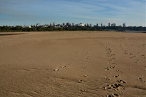 Estas imágenes corresponden al lecho del río Paraná entre la isla Curupí y la isla Puente, frente a la ciudad capital de Entre Ríos. Así está la vista, bajante mediante, en agosto de 2021, como un desierto sobre el agua.