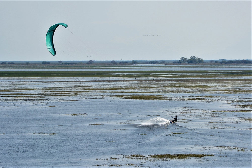 En los sesenta kilómetros de ruta de puentes que unen Victoria con Rosario sobre el delta del Paraná, desde el asfalto se pueden observar pescadores artesanales y deportivos, baqueanos de río, gente que aprovecha el borde costero para un picnic o deportistas, como el caso de esta imagen. El kitesurfing (también kiteboarding o flysurfing) consiste en el deslizamiento mediante una tabla sobre el agua por la tracción de una cometa sujeta a un arnés.